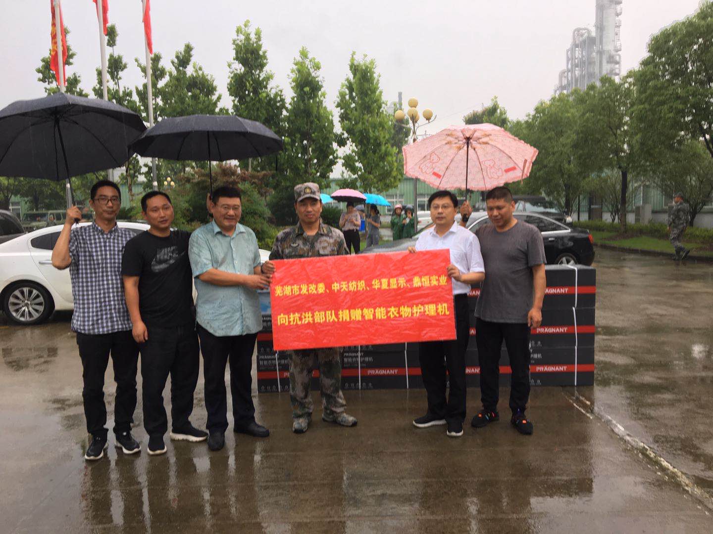 七月以來,蕪湖市持續(xù)遭受強暴雨襲擊,導致縣域內水位不斷上漲,水位值突破1998年來歷史極值,防汛形勢十分嚴峻,抗洪搶險迫在眉睫。了解到蕪湖市的汛情后,7月18日上午,安徽中天紡織科技股份有限公司等企業(yè)同蕪湖市發(fā)改委共同向抗洪部隊捐贈了智能衣物護理機用于支援蕪湖市汛情。